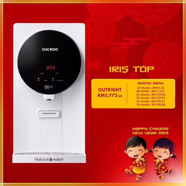 Iiris top water filter merupakan penapis air keluaran cuckoo.model ini merupakan antara modle paling popular dan top dan sering menjadi pilihan pembeli kerana rekaannya yang sesuai untuk apa. Model terbaru daripada cuckoo dengan harga serendah rm94.34 sebulan. Dilengkapi penulenan air 6 peringkat, beserta 13 pilihan suhu air. Kenapa air masih tak sejuk? Miliki cuckoo iris top water filter dengan cuckoo good plan.dengan pelan ini anda boleh memilih dari 6 pakej bayaran bulanan yang ditawarkan.selain itu cuckoo good plan menawarkan servis.
